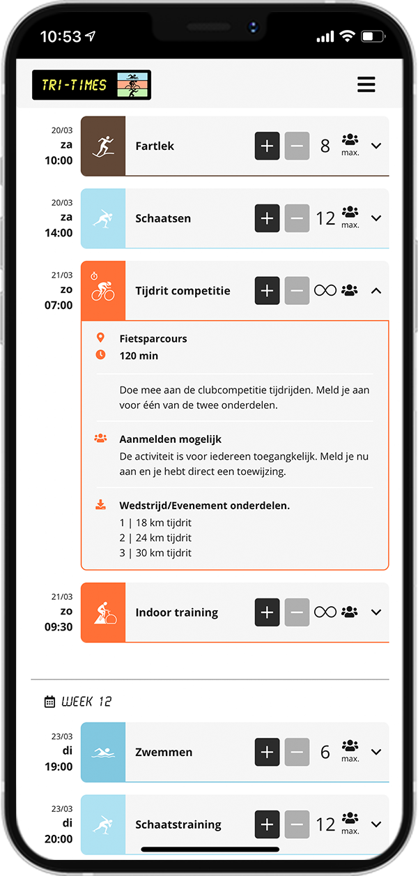 Tri-Times is voor verenigingen en clubs met een aanbod van uiteenlopende activiteiten. Het gemnak van de automatische publicatie functie van activiteitendat de app 24 uur per dag bereikbaar isd op telefoon, tablet of computer maakt Tri-Times een onmisbare tool voor elke club. Tri-times geeft trainers vooraf inzicht in de opkomst van een activiteit als je bijvoorbeeld aanmelden zonder limiet gebruikt.